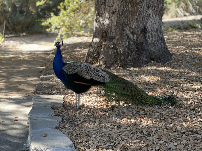 现在孔雀们在帕萨迪纳和洛杉矶东北部圣盖博谷的城镇自由游荡,成千上百,成群结队。它们或是进入人家院子里、降落在屋顶上或者在人行道上漫步。 没有人确切知道它们的数量,但它们多产繁殖,在大流行期间,变得更多,而且叫声扰人。
