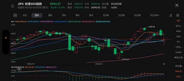 标普500指数下跌 0.76%,收于 5,994.57 点。 纳斯达克综合指数下跌 1.2%,收于 19,391.96 点。道琼斯指数在盘中一度大跌665.6点,随后收复大部分失地,最终收跌122.75点,收于44,421.91点。