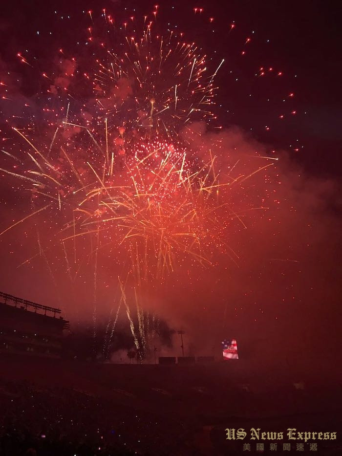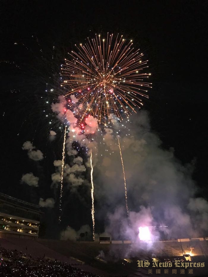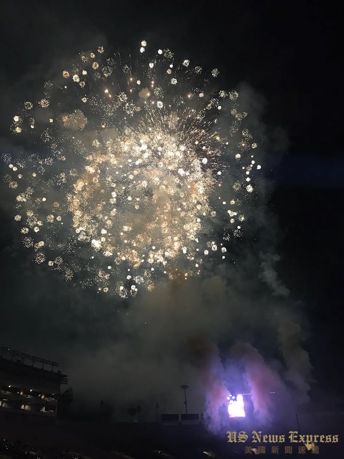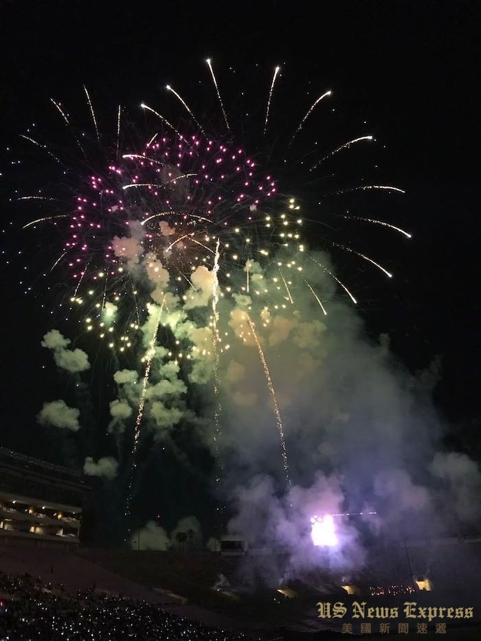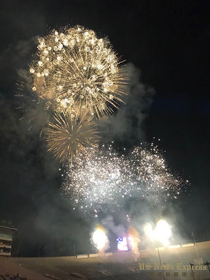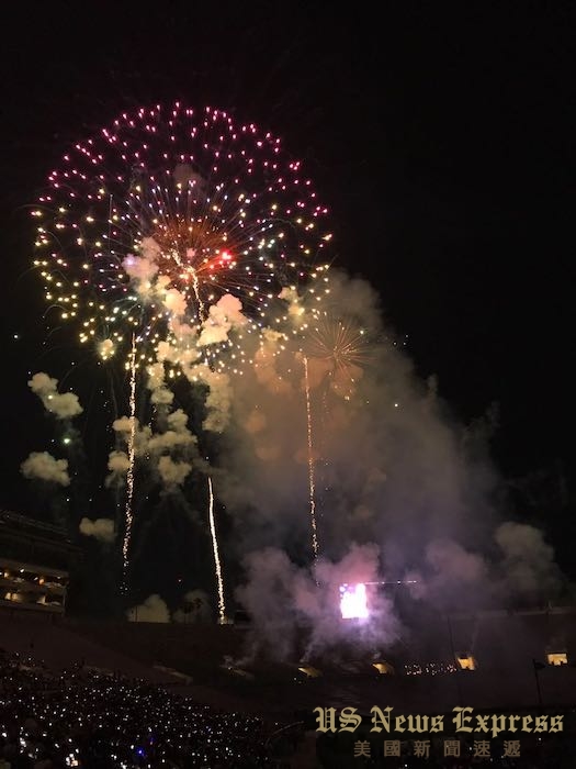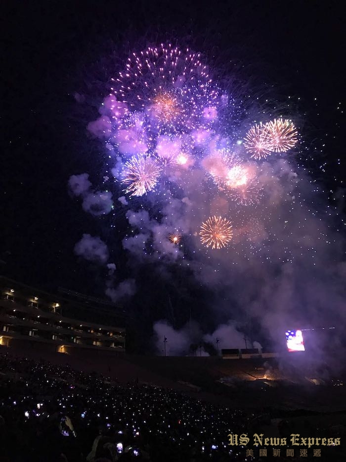 帕莎迪那玫瑰碗当天举行了南加地区规模最大的烟花秀,2.5吨的烟花在天空中绽放照亮了半个城市,也震撼了每一位在场观众。以下为《美国新闻速递》朱政带来的精彩现场图片: