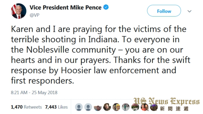 同是印第安纳州居民的美国副总统潘斯(Mike Pence),已在社群网站对此案表达关切,说他正为伤者祈祷。也感谢警方和急救团队反应迅速。印州州长霍尔库姆(Eric Holcomb)也在社群网站中贴文指出,正在密切关注此枪击事件。