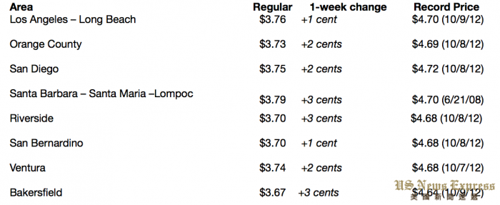各城市油价信息。AAA提供