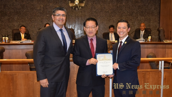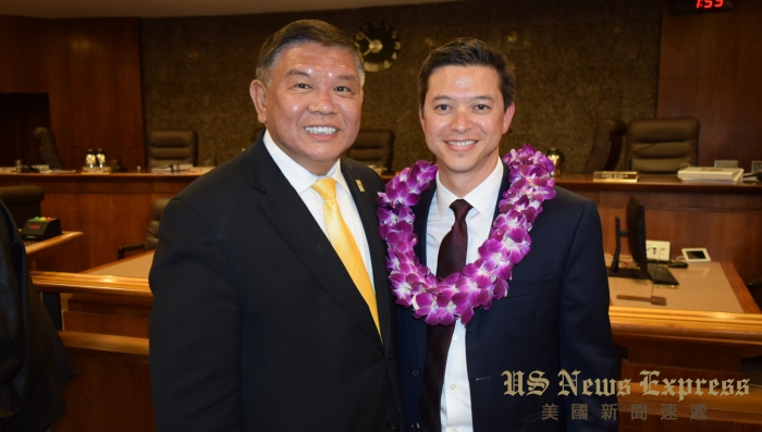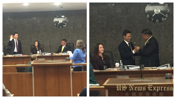 南加州聖蓋博谷內亞裔居民近半的阿罕布拉(Alhambra),於5月29日晚間的例行市議會中,舉行新一屆輪任正、副市長就職典禮。市議員沈時康(Stephen Sham)將市長席交接給原任副市長的馬隆尼(Jeffrey Koji Maloney)。日裔律師馬隆尼是在2016年11月當選就任阿市議員,這也是他進入阿市議會後首度輪值擔任市長一職。