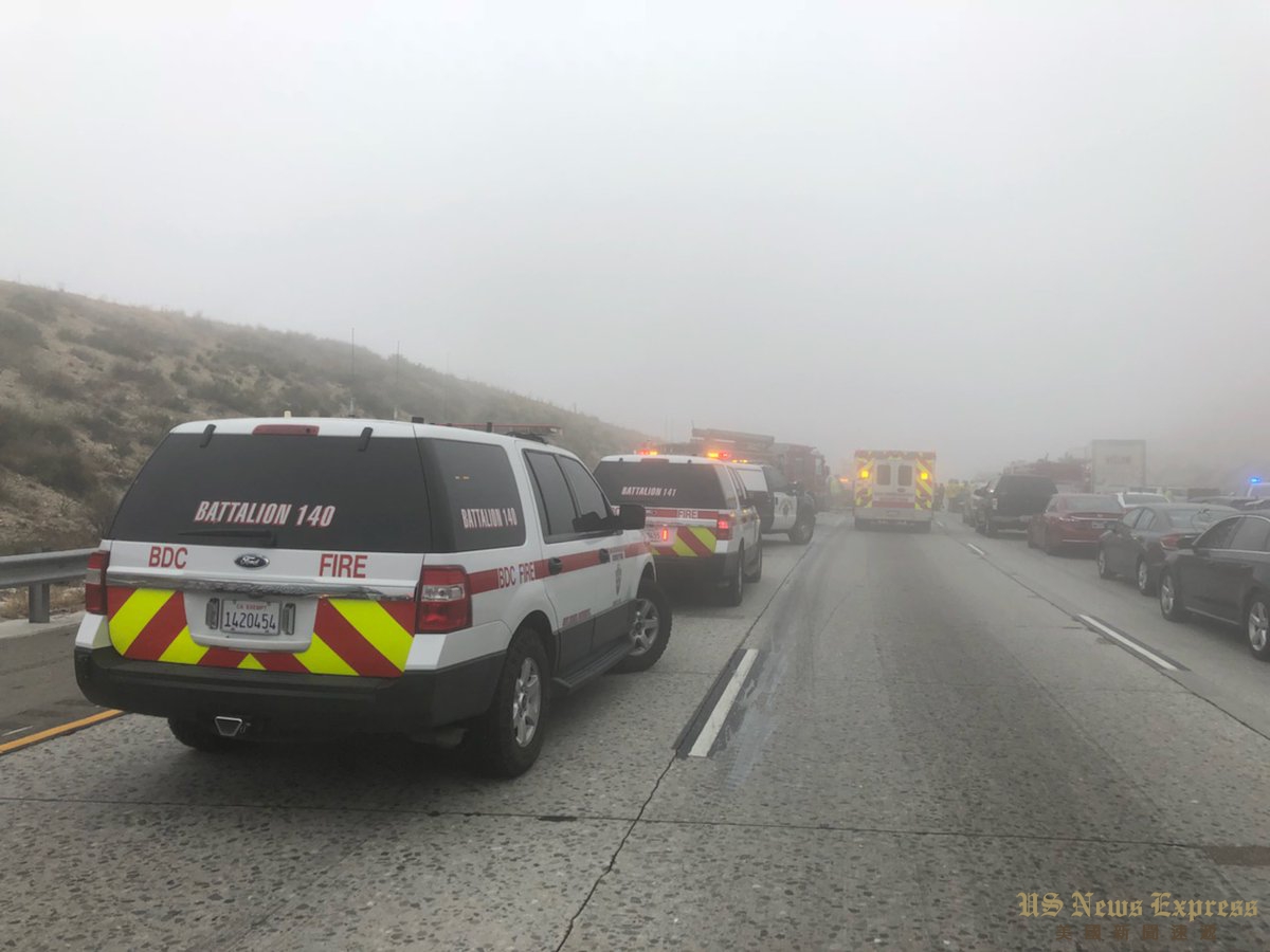 消防局派出10辆消防车,1辆卡车,14辆救护车以及多队救护人员到现场,目前所有伤者都被送往医院接受治疗。但是事故现场南行车道仍旧关闭,加州公路巡警在现场调查车祸的起因。初步鉴定为大雾造成视野不清。