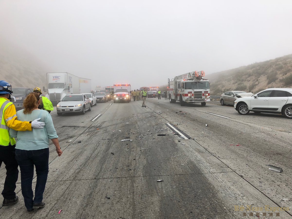 本周三(30日)清早大雾,圣伯纳丁诺郡通往赌城拉斯维加斯的15号高速公路上发生严重车祸。加州公路巡警表示,车祸造成至少17人受伤,属于重大交通事故。