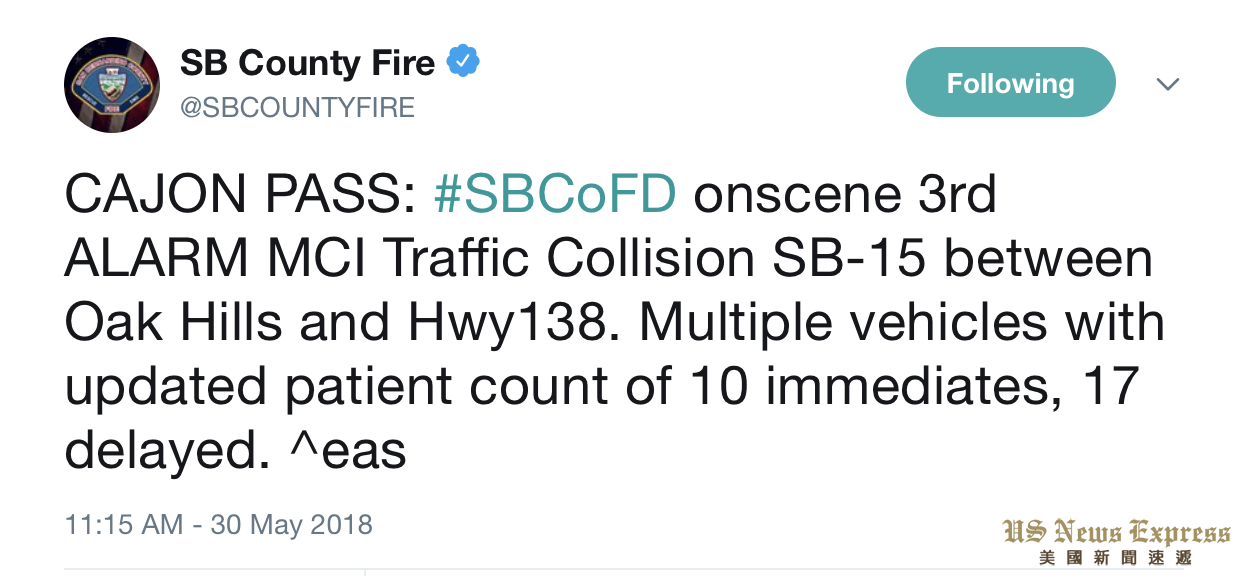 圣贝纳迪诺县消防部门30日上午发布了三级警报,15号高速路位于Oak Hills和138号高速公路之间发生严重车祸,私家车和大卡车撞在一起,造成至少17人受伤。
