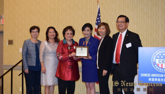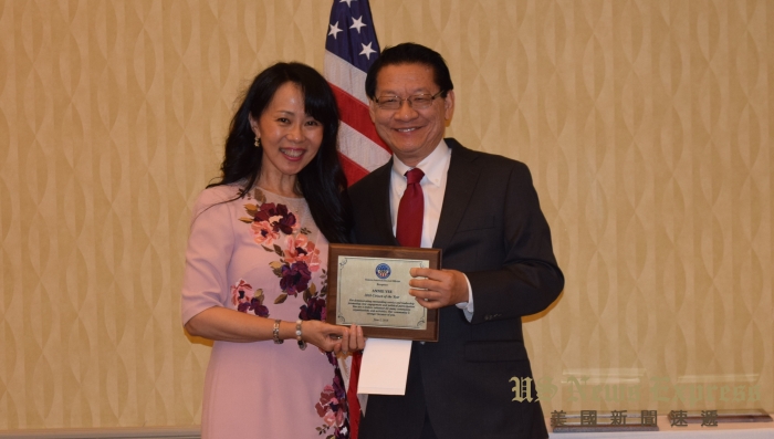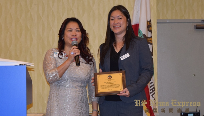 前加州眾議員伍國慶(右)頒發公民大獎給華埠同源會前會長余麗君(左)。錢美臻攝