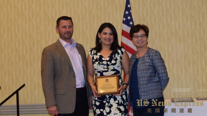 柔斯密市議員勞朱嘉儀(右)頒發商業夥伴大奬給共和垃圾回收公司(Republic Services),由該公司經理Elizabeth Martinez(中)代表領獎。錢美臻攝