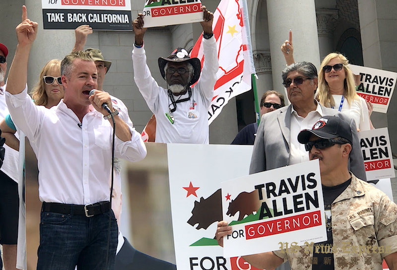 6月5日加州初选投票当天,加州州长候选人艾伦(Travis Allen)与支持者们来到洛杉矶市府大楼造势。来自橙郡杭廷顿滩的艾伦目前是加州第72选区众议员,自称“最保守共和党”的他主张“夺回加州”。