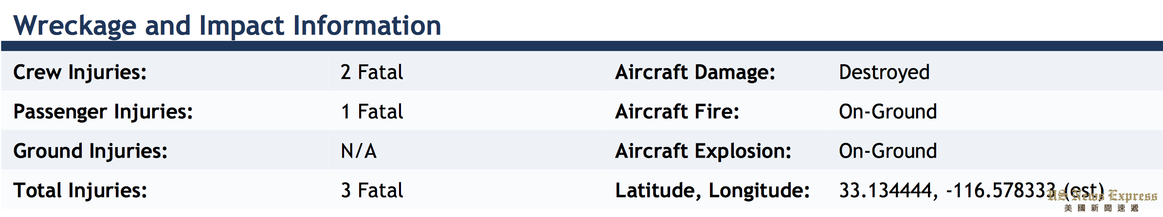 记者本月7日获得美国国家运输安全委员会提供的初步事故报告,其中包含该航空学校负责人提供的背景信息。报告中指出,5月10日太平洋时间晚间8时31分,斯堪的纳维亚航空学院的一架比奇BE76双引擎飞机(N803FC)在加州朱利安附近飞行时撞山。机内飞行教练和两名学生受到致命伤害,飞机坠毁后起火。