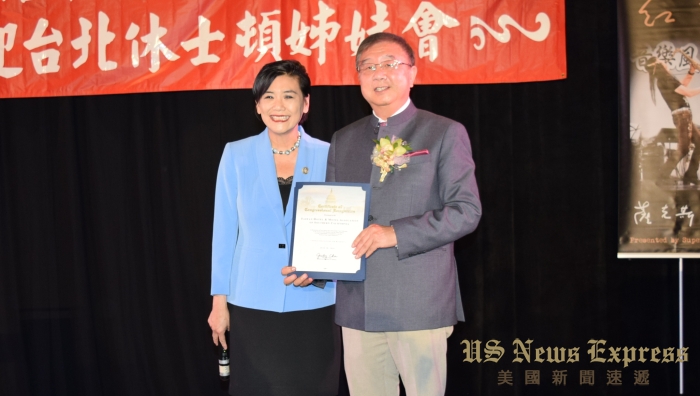 聯邦眾議員趙美心(左)頒發賀狀給南加州台灣旅館業同業公會會長李德揚(右)。錢美臻攝