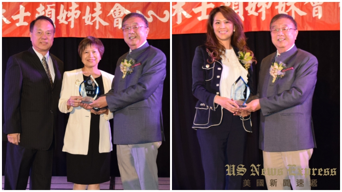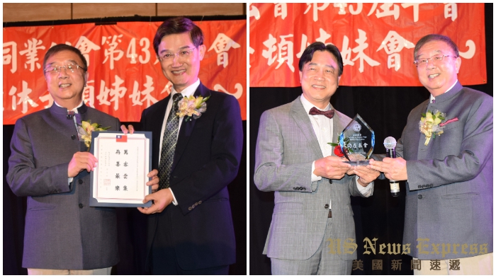 洛杉磯經文處處長朱文祥(左圖右)頒發賀狀給南加州台灣旅館業同業公會會長李德揚(左圖左),(右圖)李德揚代表該會頒發「最佳理事獎」。錢美臻攝
