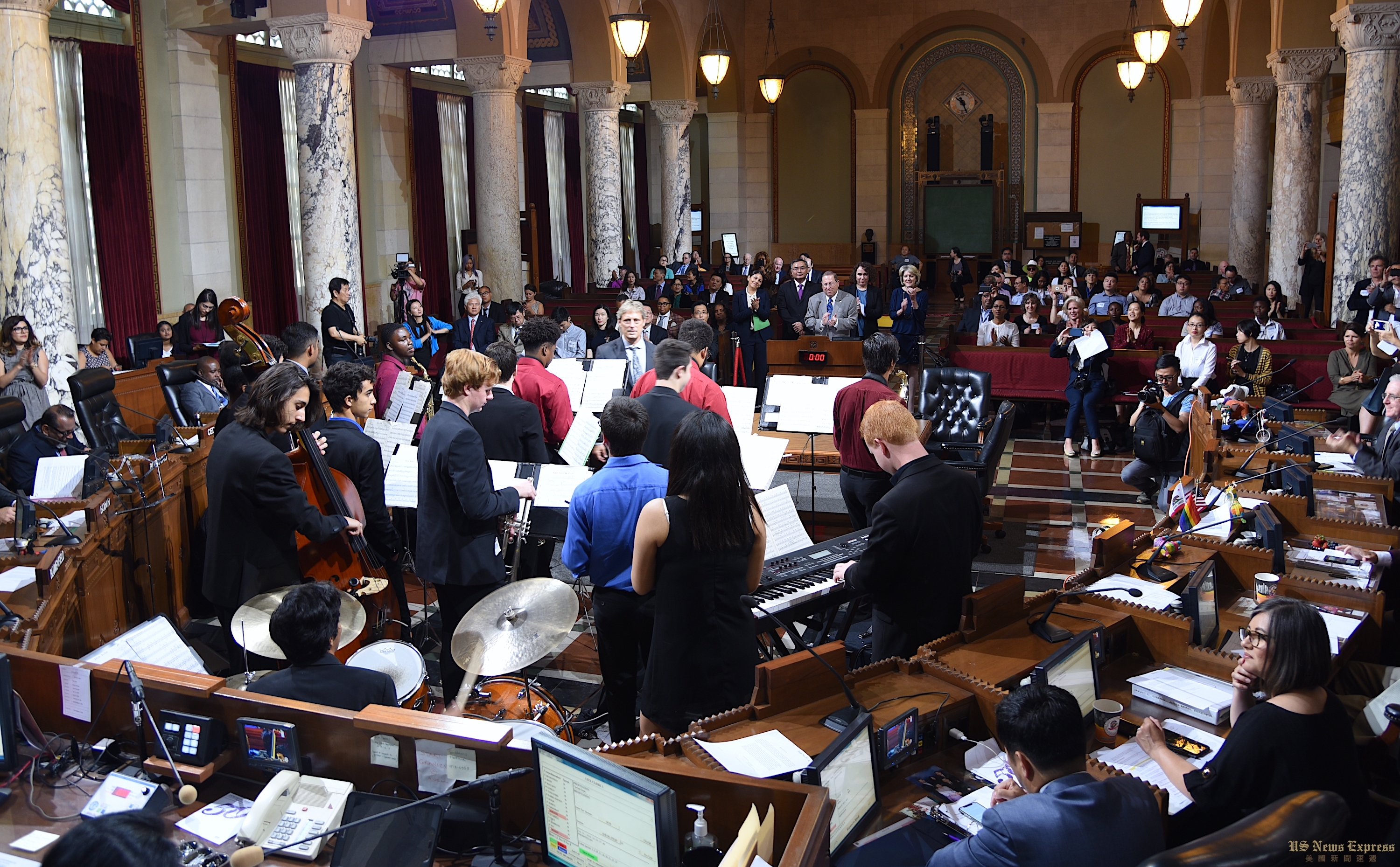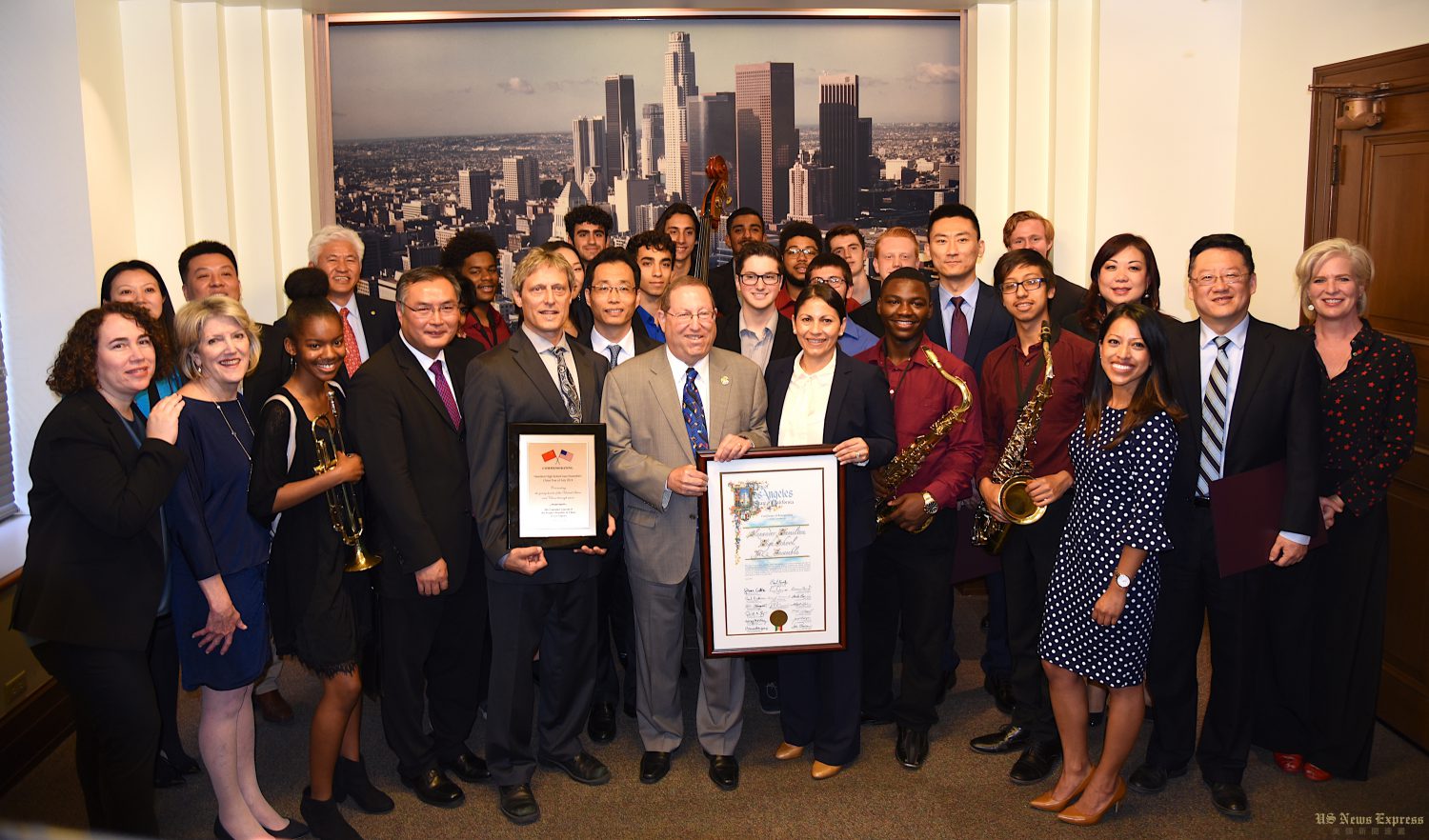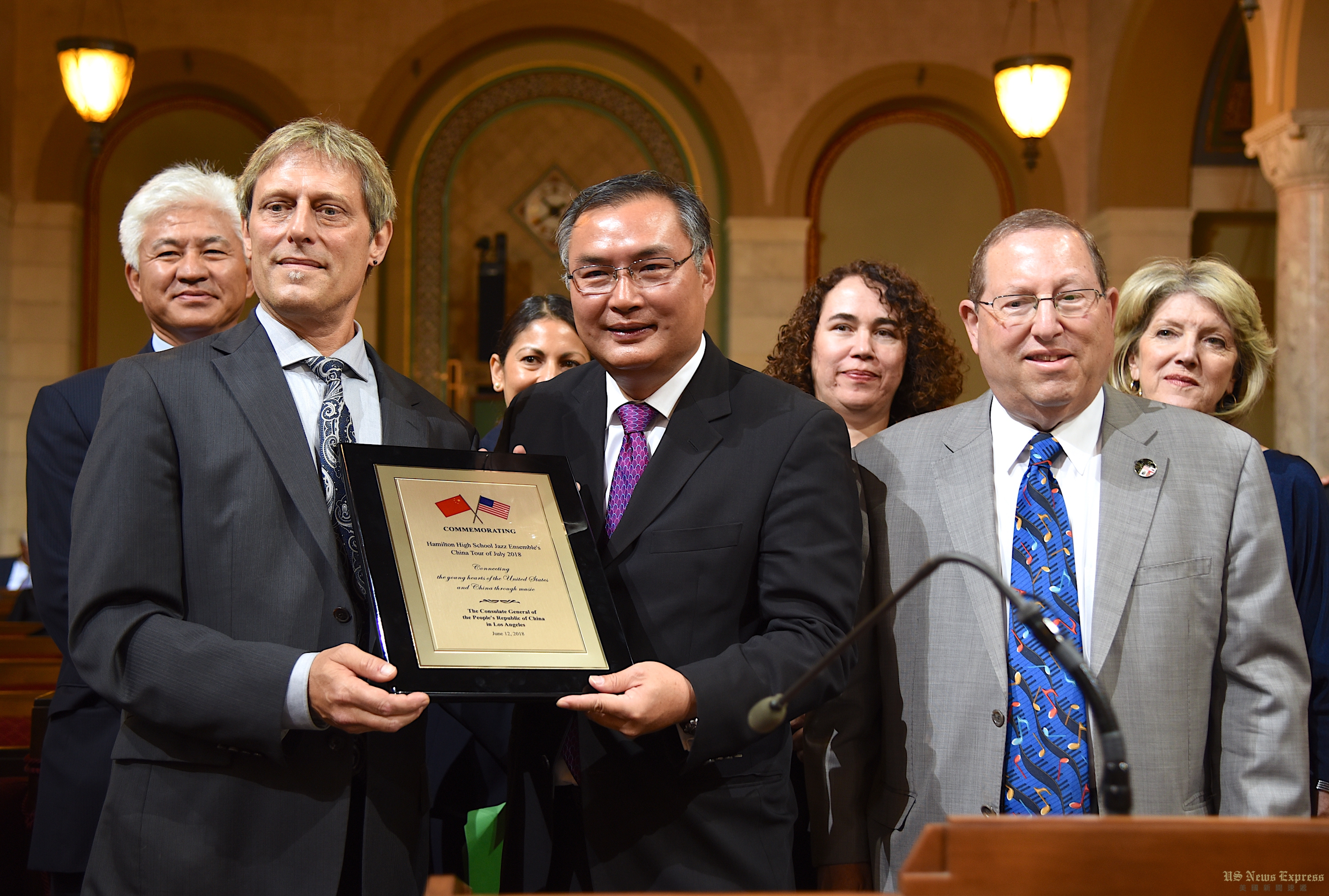今年7月份,美国洛杉矶汉密尔顿高中(Alexander Hamilton High School)的轻爵士乐团,将在美国中资企业的赞助下,访问中国上海和成都,并参加年度国际青少年音乐节。本月12日,中国驻洛杉矶总领事张平特地来到洛杉矶市府祝贺这群小音乐家们,他也希望这些小小文化使者们可以通过音乐搭建中美两国交流的桥梁,增进友谊。