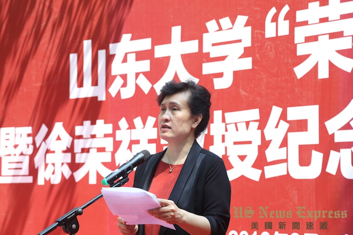 她说,山东大学源远流长,为国家与社会培养了无数优秀人材。而山大的发展,离不开社会的支持与企业的支持。美宝集团就是这样的企业。美宝集团热心公益,形成了深厚的公益文化和广泛的国内外影响力。美宝集团的创始人徐荣祥教授,是人体再生复原科学领域的首要科学研究人员与倡导者。他一生致力于再生科学研究,在再生医学科学领域做出了杰出的贡献。作为一名中国医生,他的名字出现在哈佛医学院的荣誉墙上,他的一生践行了对医疗技术的不懈追求和对生命科学的倾力探索,他作为一名医者的仁爱精神和科学精神值得我们,尤其是青年医学学子学习和借鉴。“荣祥楼”的冠名也是山东大学作为家乡的著名高校对徐荣祥医生人格与成就的深度认可和崇高礼遇!