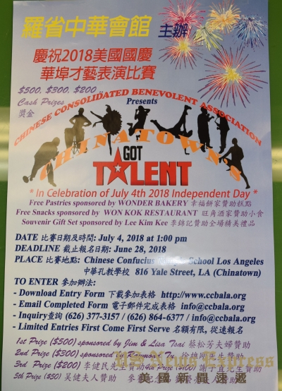 為慶祝2018年度7月4日的美國國慶(獨立紀念日),羅省中華會館暨全僑各界擬於7月4日(週三)全天,在洛杉磯華埠地區舉行全天的活動。內容包括上午的全僑慶祝美國國慶升旗典禮,下午的華埠才藝表演比賽及晚間的國慶餐會。才藝比賽更提供了高額獎金,以鼓勵社區有才華的民眾登台展現才藝。