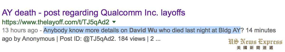 记者向高通公司的职员了解到,死者吴大卫(David Wu音译)为高通公司的工程师,6月17日晚间在高通公司的AY大楼上坠落。高通公司已经发布信息通告所有员工,并希望员工积极使用公司的24小时求助计划。
