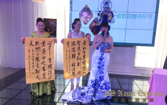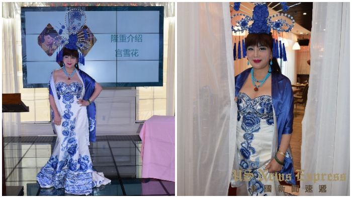 1948年生於上海的宮雪花,堪稱外在美與內在智慧結合的真正美人。她在洛城影迷見面會中,以一襲中國風”青花瓷”花色的低胸晚裝登場,呈現出熟女御姐的華貴風韻,無愧於「中國第一美婦」之名,在全場驚豔中華麗入場。