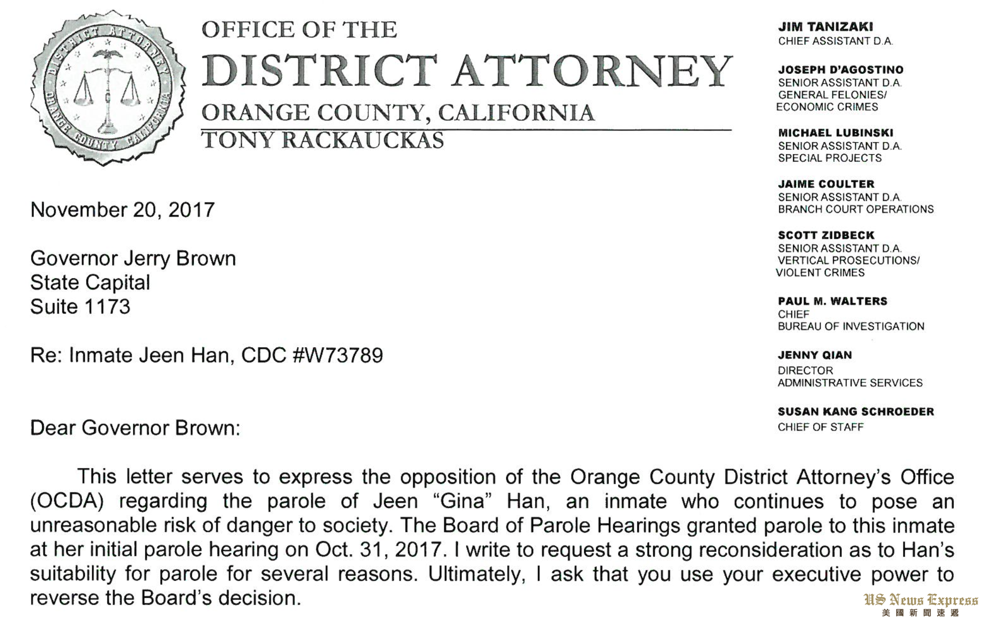 22年前发生在橙郡尔湾的韩裔双胞胎姐妹谋杀未遂案,震惊了美国及国际社会。当时22岁的韩吉娜(Jeen Gina Han)伙同两名未成年人密谋杀害双胞胎姐妹未遂,韩吉娜也因此获刑26年。今年,韩吉娜假释出狱。橙郡检察长向加州州长请愿,指称韩吉娜仍旧存在心理问题,善于操纵他人,将危害社区,希望州长推翻韩吉娜的假释权。