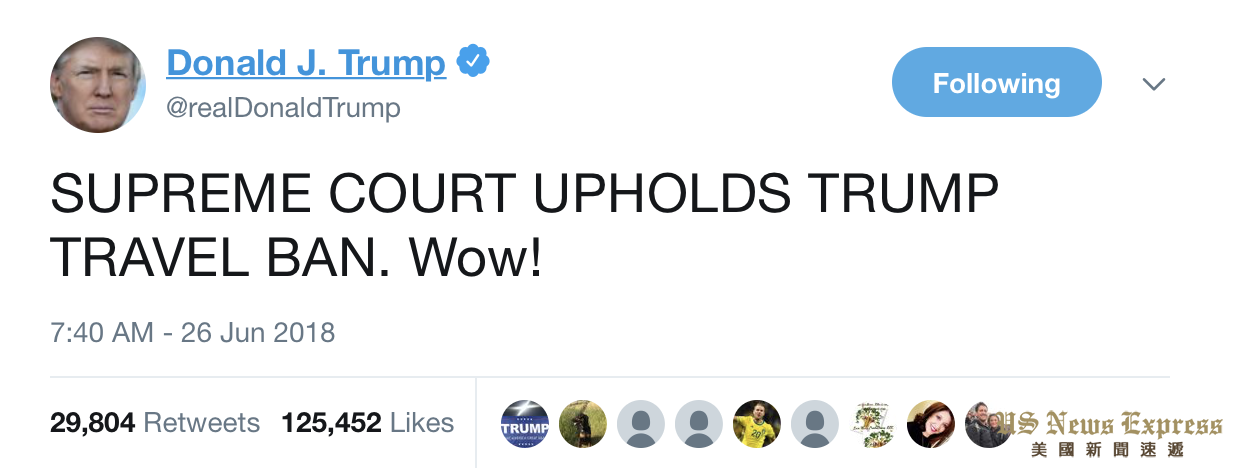总统川普随后在推特上回应:“最高法院支持旅行禁令,哇!”