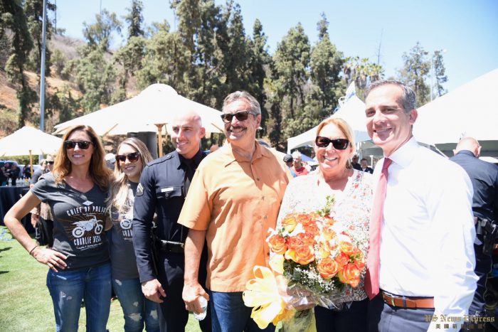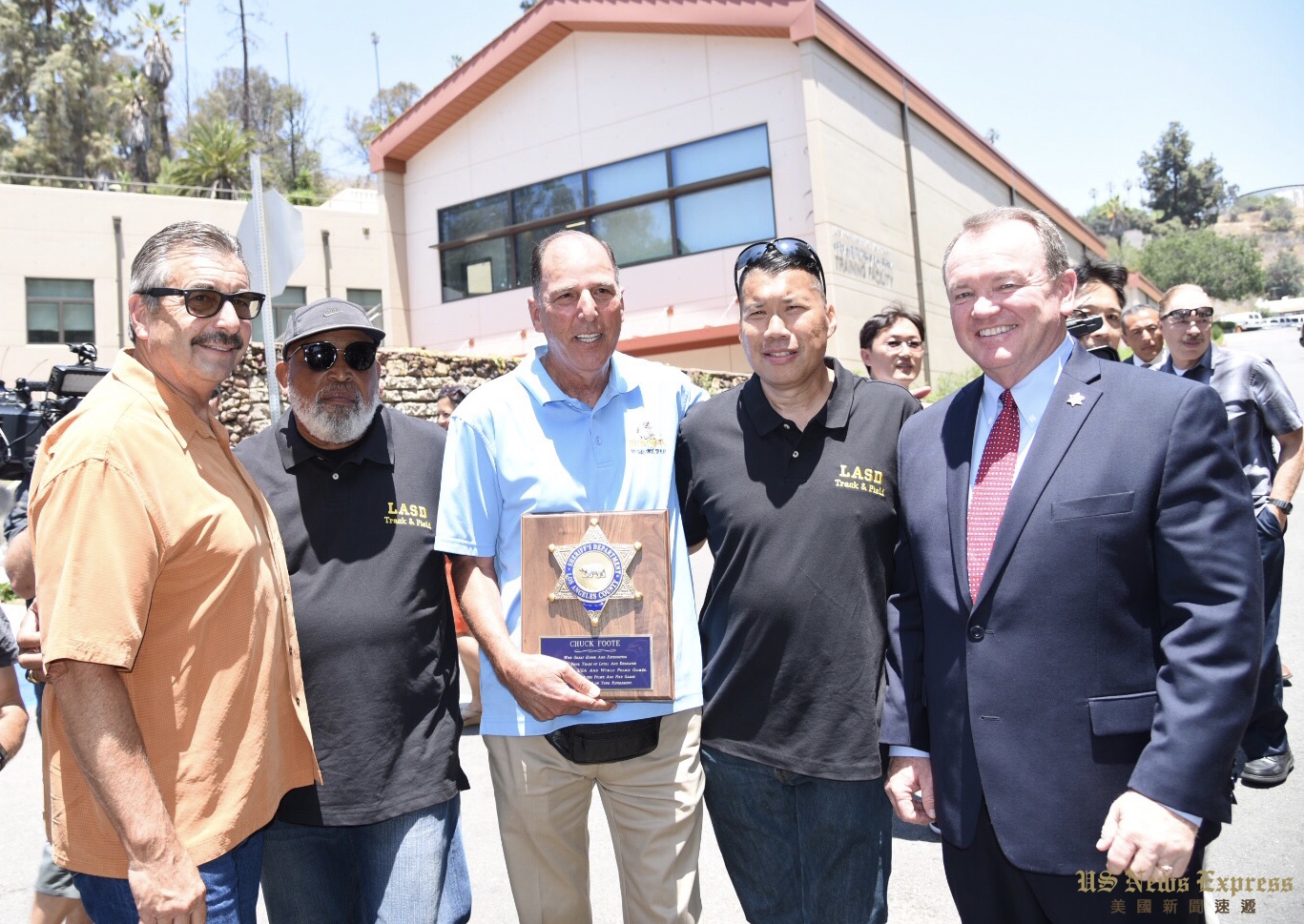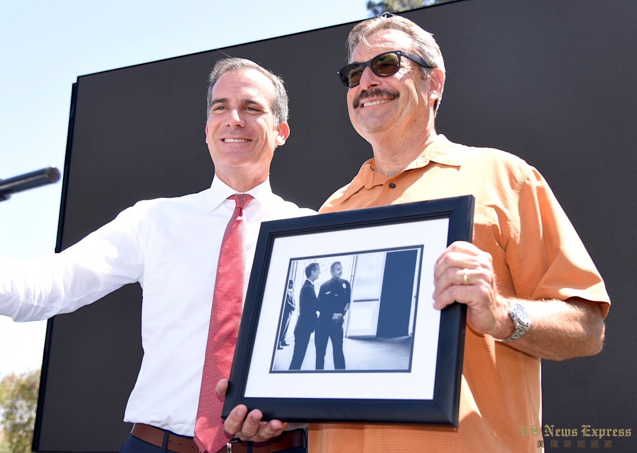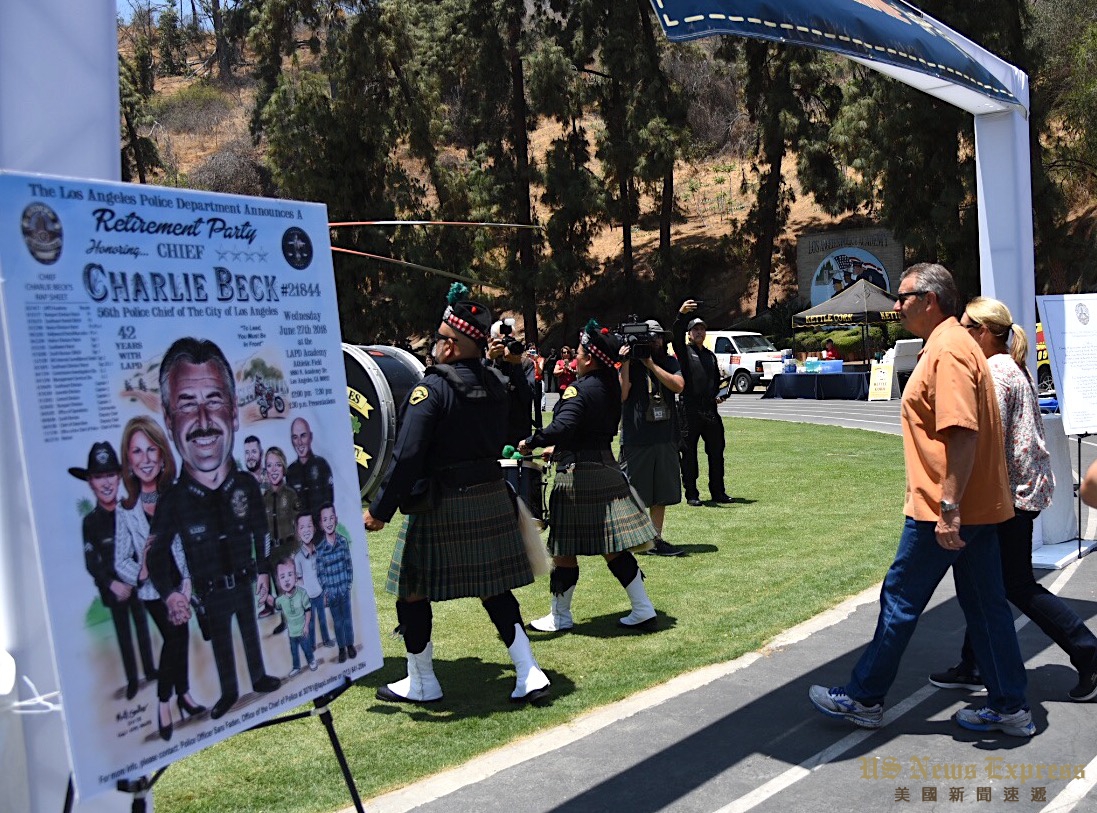 贝克的退休派对从27日中午一直进行到晚间7点,他所有政府、执法部门的朋友、同事们都抽时间赶来向他送上祝福。现场还有各种警车、执法工具展示,洛杉矶市警局反恐部门获得的全新直升机当天也陈列在现场供大家参观。好吃的、好玩的,每个人都尽兴而归。