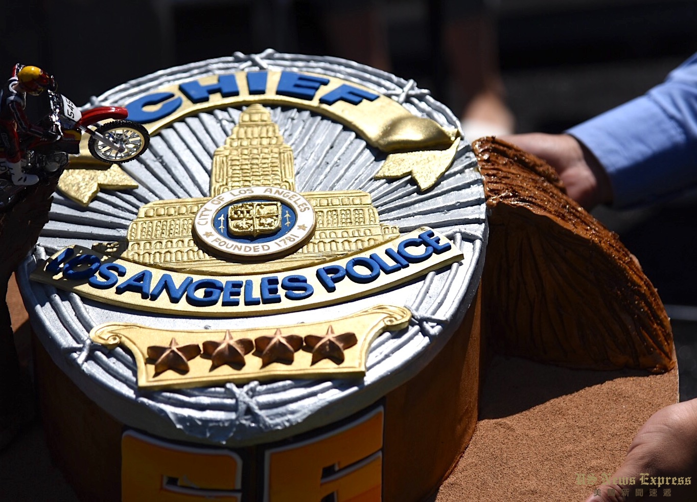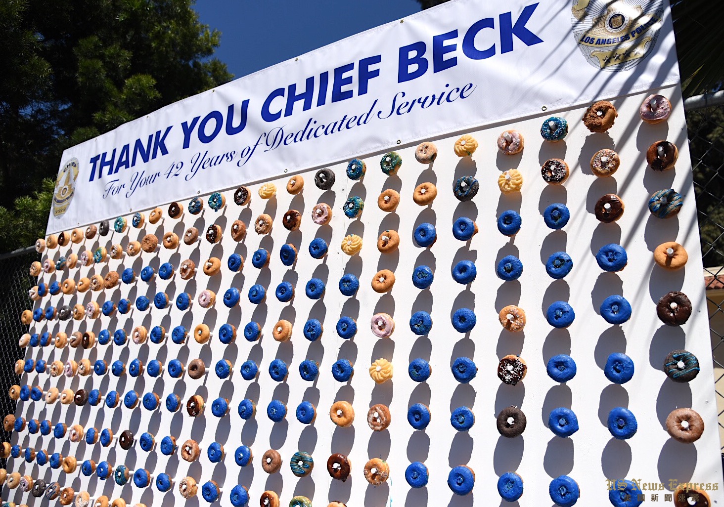 洛杉矶市警局为欢庆贝克退休的派对,27日下午在位于艾莉西亚公园的洛杉矶警察学院举行。这里是42年前,贝克接受培训加入警局的起点,今天作为他警察生涯的终点特别有意义。来自美国各界执法机构和政府机构的老友都专程前来庆祝他退休,现场卡片、鲜花、照片、礼物不停,贝克也格外的开心。