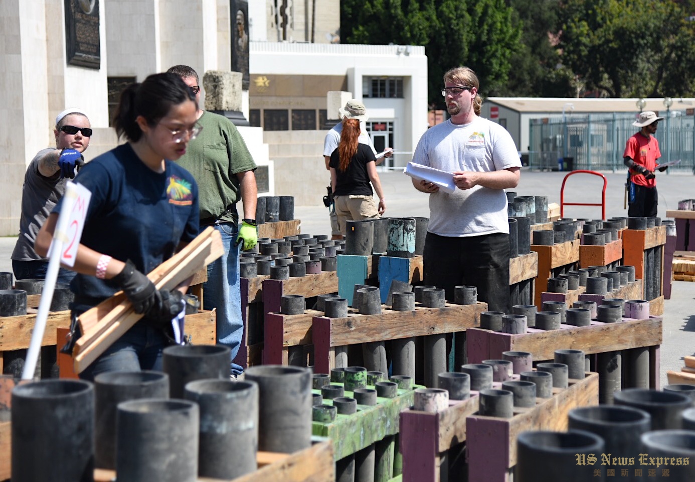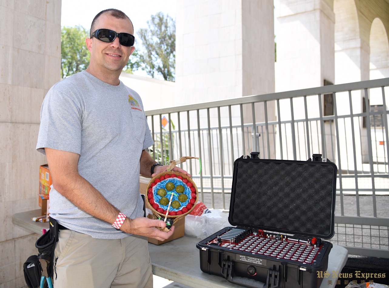 在现场装置的烟花专家托克斯坦(Mike Tockstein)向记者介绍,今年的烟花表演长达22分钟,洛杉矶纪念体育馆内、外共设有两处燃放点,分为前景和背景。整场烟花表演完美的搭配了爱国音乐,节奏紧密,色彩绚丽。
