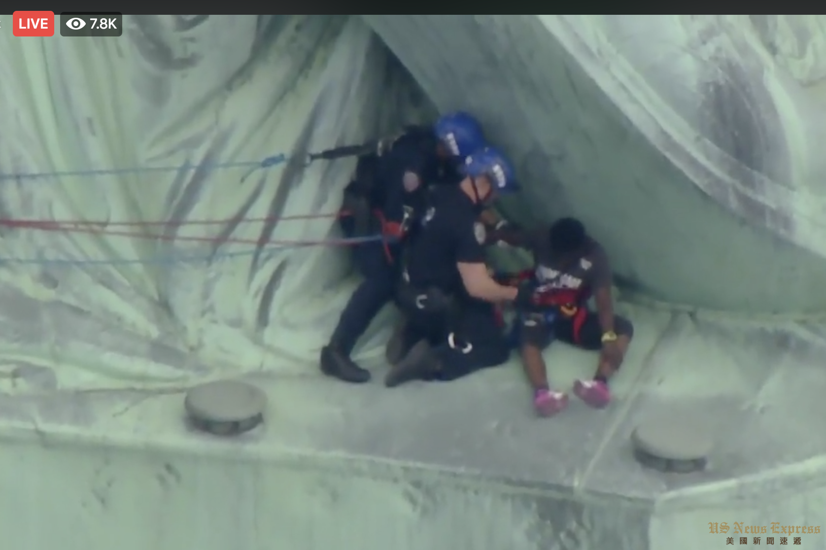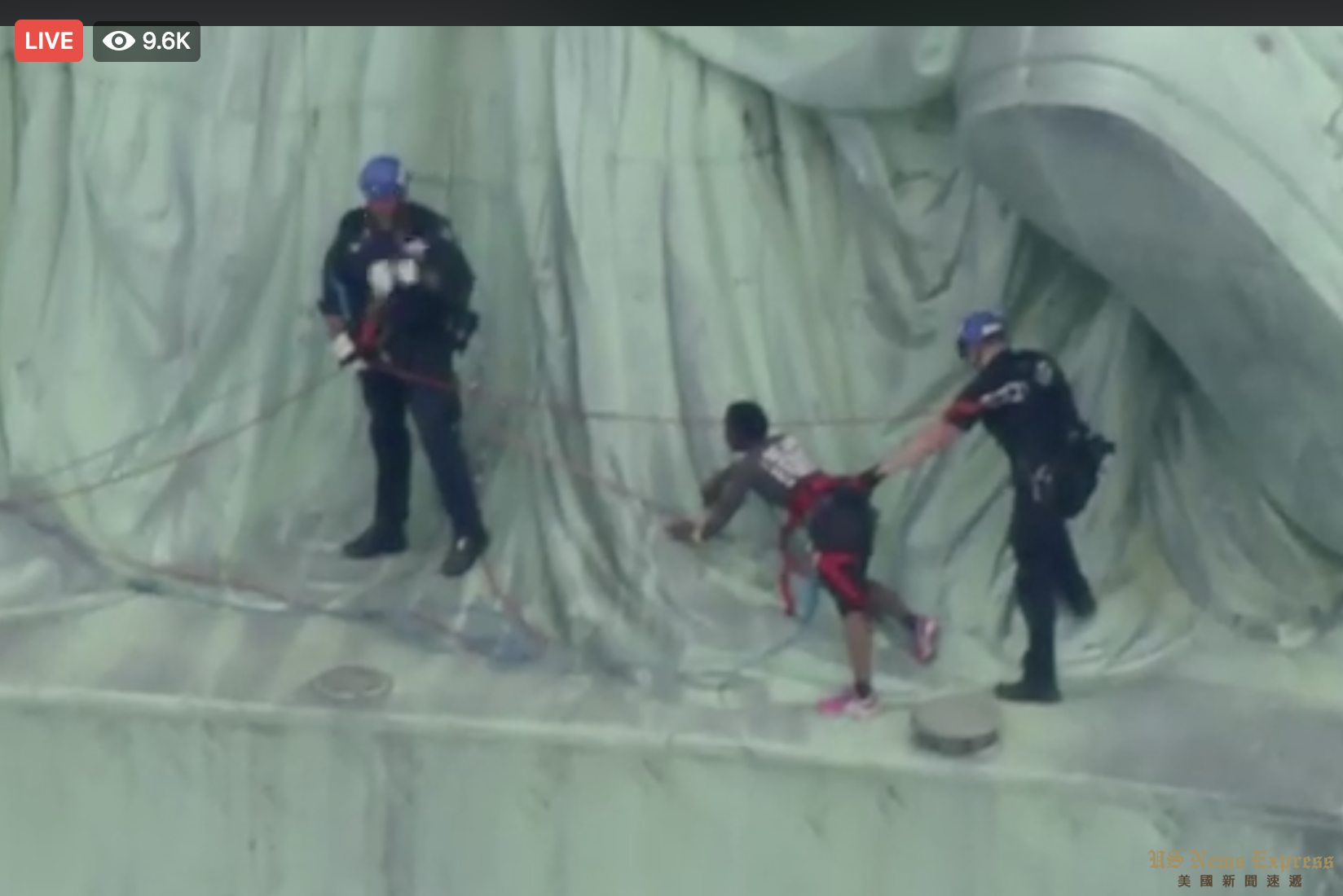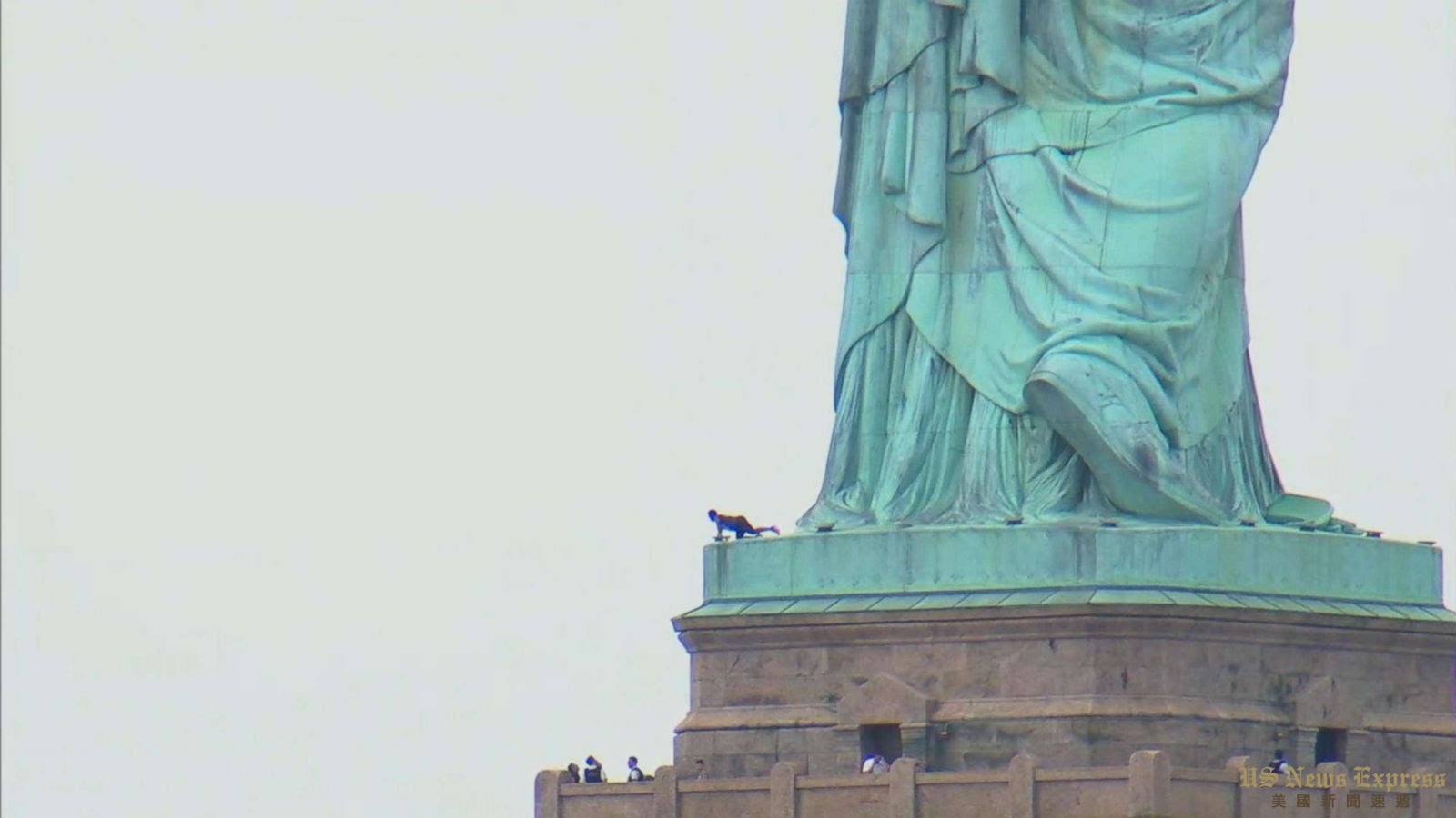 美国独立日当天很多民众聚集在纽约自由岛欣赏自由女神像(Statue of Liberty)的风姿,然而4日下午,自由岛上迎来不速之客。一名女子攀爬到自由女神像上,执法人员将整个自由岛紧急疏散劝说她下来。当天上午也有7人因在自由女神像底部挂起抗议移民局的横幅被捕,警方表示,目前尚不清楚两起事件是否有关。