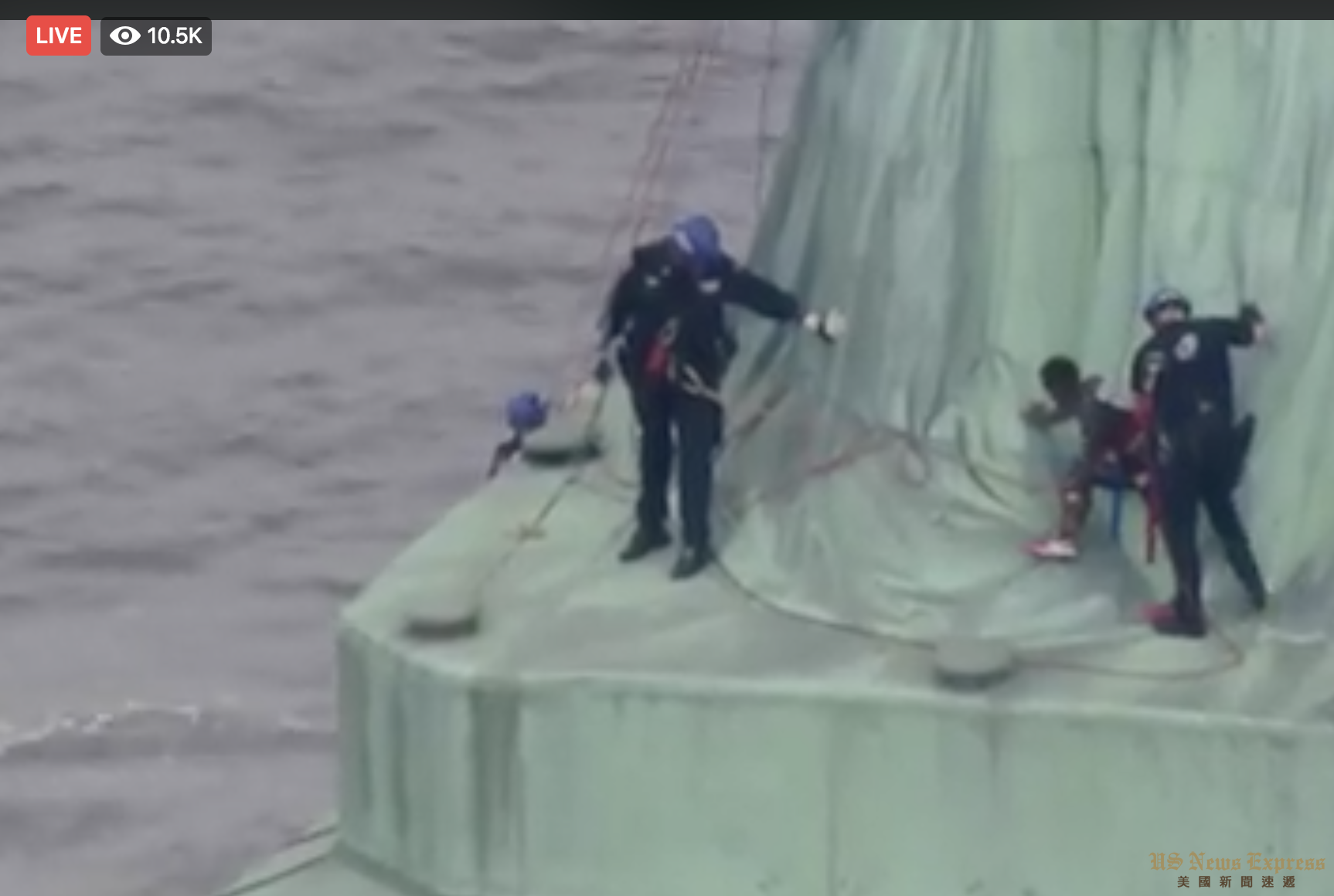 两名警员仍在小心翼翼的帮助女子爬下自由女神像,以防止她伤害自己或伤害到他人。