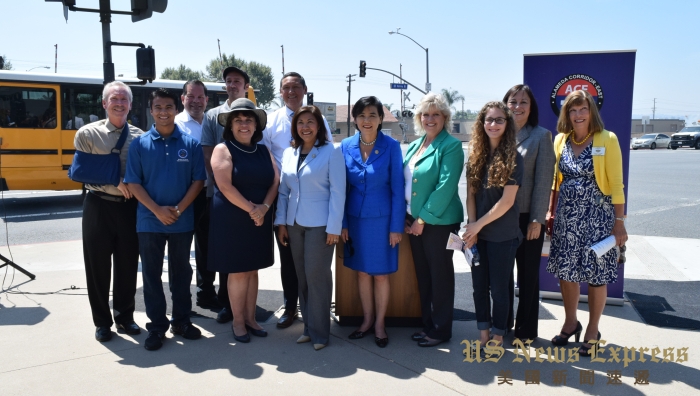 多位政府官员和加州州立理工大学代表於5日,与圣盖博谷基础工程与建设委员会监管的阿拉米达东区走廊工程(ACE)的工程人员,一起在波莫纳大道和天普街旁人行道,庆祝一条新货运铁轨改道路线的开通。