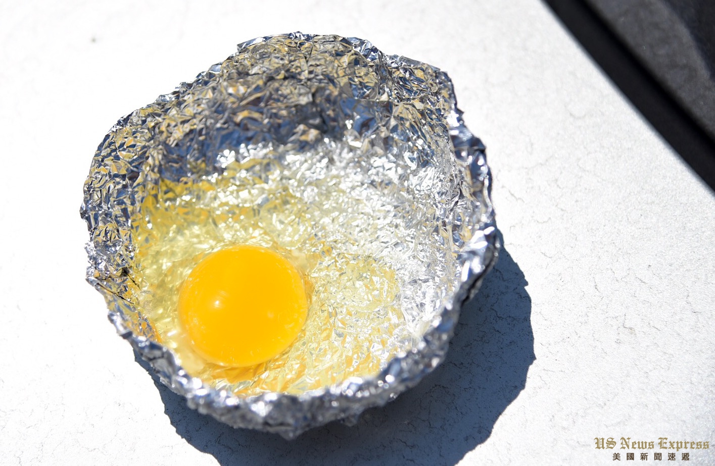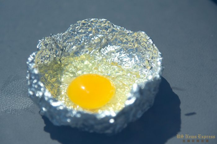 气象局报告显示,洛杉矶市中心中午时分温度为105度,记者将一个鸡蛋打在锡纸碗中,放在汽车前车窗上。
