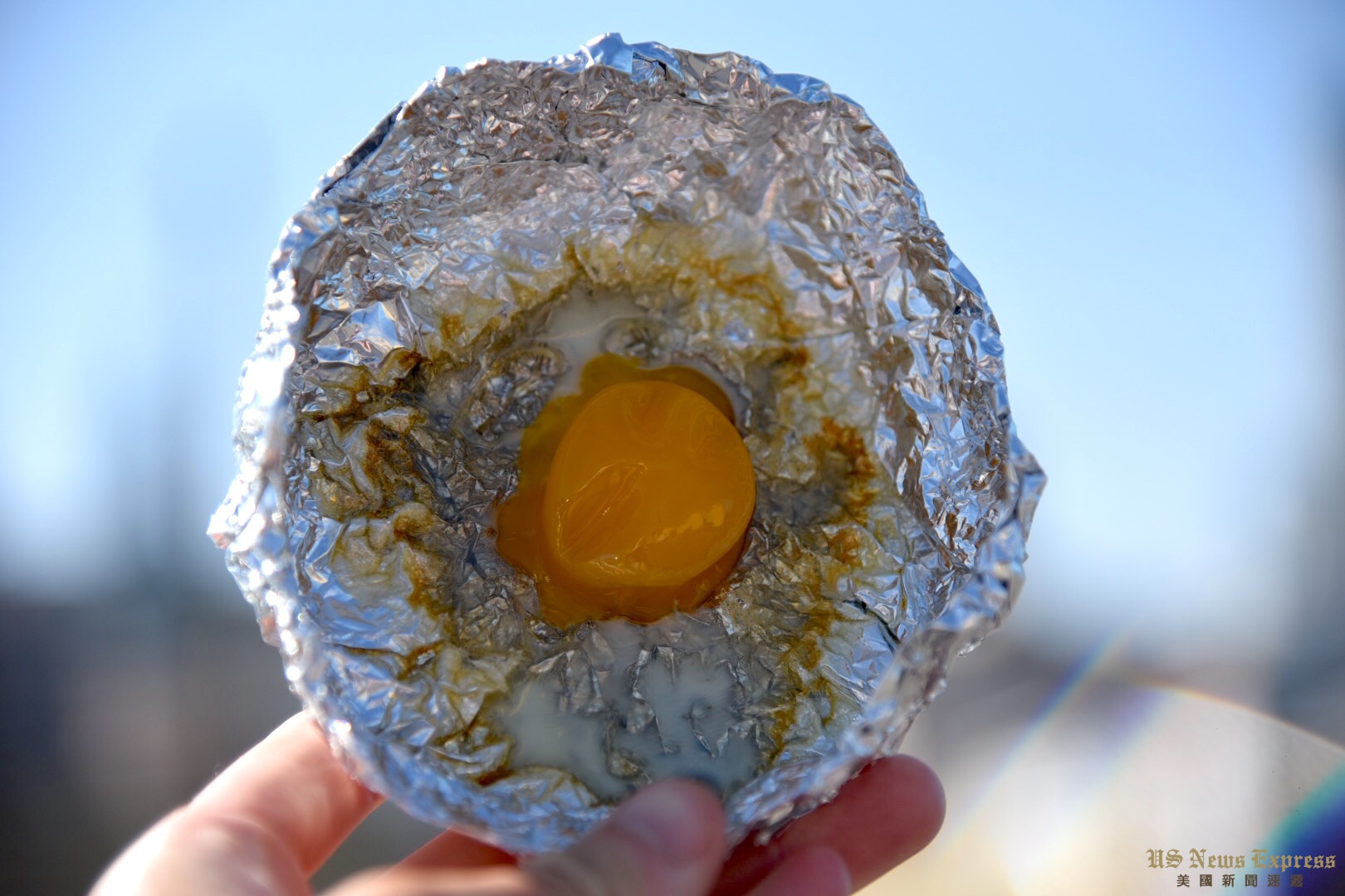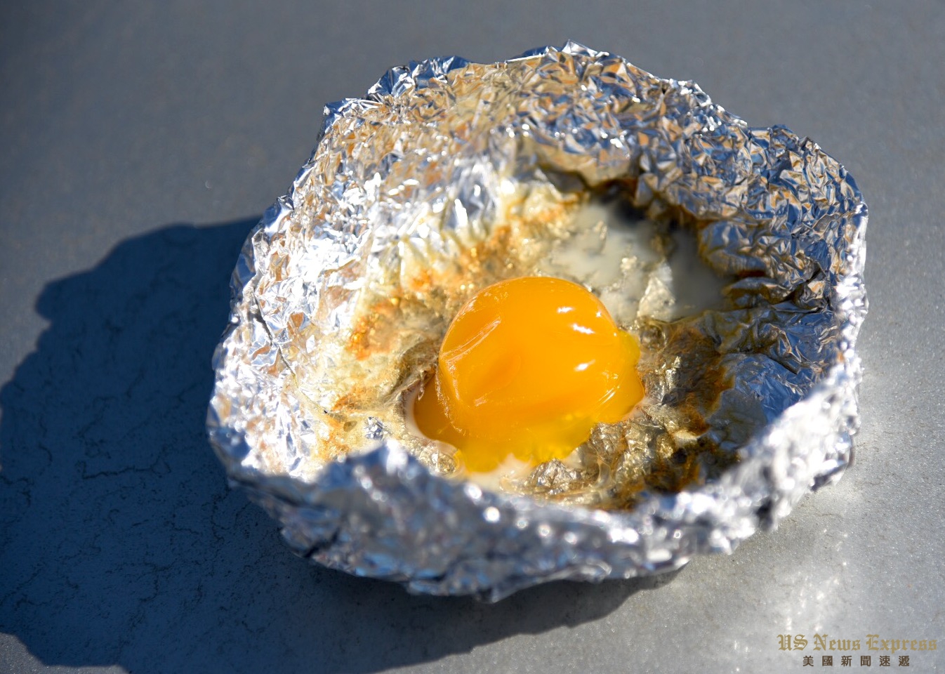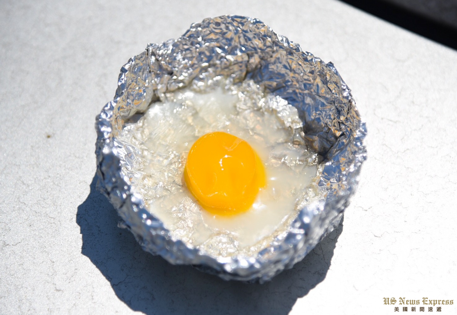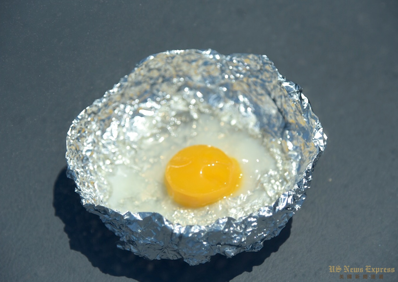 又一小时过去,市中心的气温为102度。锡纸碗内蛋白已经变得薄薄一层,蛋黄也彻底凝固。