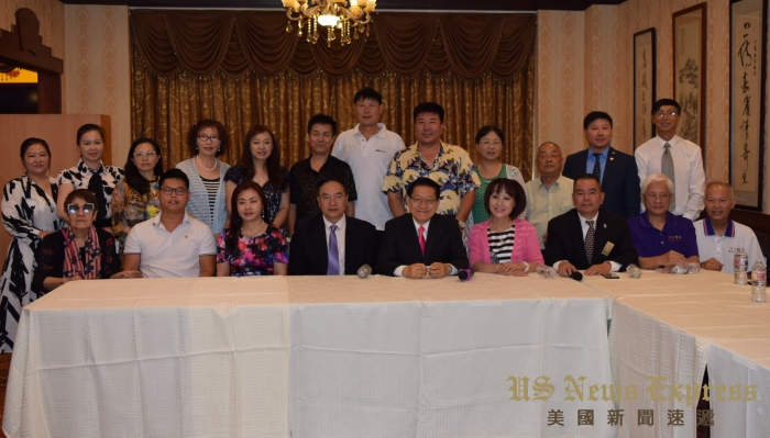 南加州华商领袖们7月9日表示将为参选加州参议员席位的伍国庆(前左5)举办造势晚宴。钱美臻摄