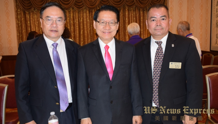 (左起)美国华人总商会会长程远丶加州参议员候选人伍国庆丶美国亚洲人商会会长李锦生。钱美臻摄