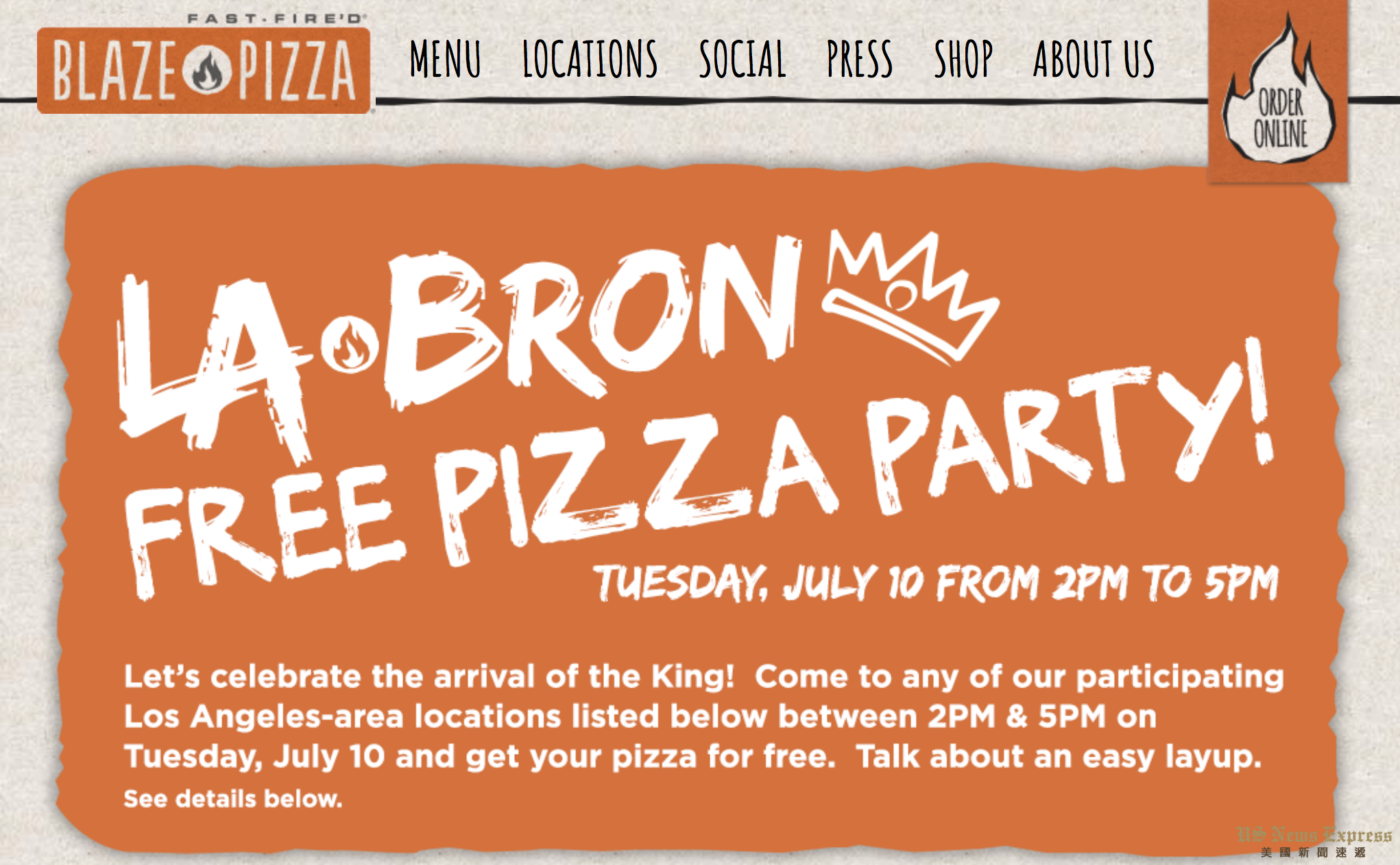 “詹皇”詹姆斯(LeBron James)本周正式签约洛杉矶湖人队,为了欢迎詹姆斯来洛杉矶,连锁披萨店Blaze宣布在7月10日下午2点到5点,为所有人提供免费披萨。