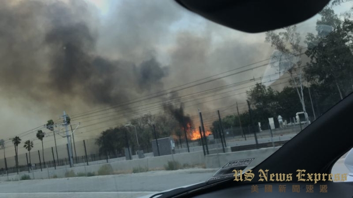 厄文戴尔野火在11日下午快速蔓延并危及210公路和金线捷运。洛县消防局图