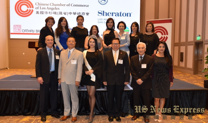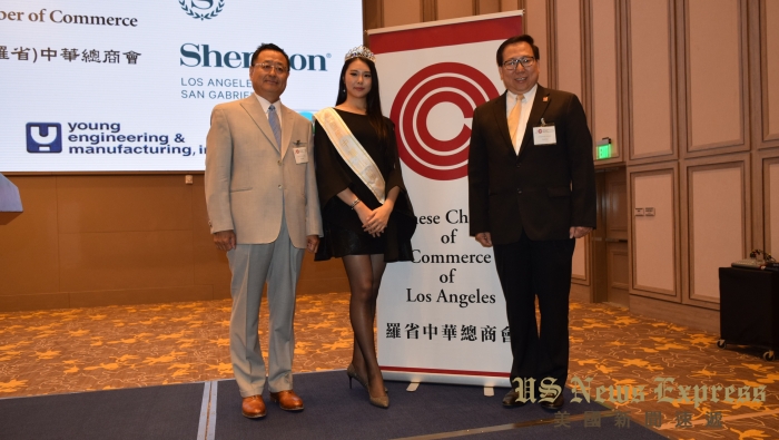 (左起) 美国洛杉矶(罗省)中华总商会会长李军丶2017年华埠小姐皇后刘思延丶美国洛杉矶(罗省)中华总商会主席庄佩源。钱美臻摄