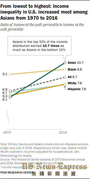 皮尤中心的最新数据显示,美国亚裔人口中的贫富差距越来越大。2016年,美国收入最高的亚裔人口的收入,是收入最低亚裔人口的10.7倍。1970年,最富有的亚裔是最贫穷的亚裔收入的6.1倍。
