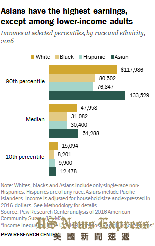 皮尤高级研究员科赫尔(Rakesh Kochhar)表示,“亚裔美国人经常被描述为美国成就最高的群体,但很明显亚裔也是经济上最分裂的群体,其中很大一部分亚裔的收入远远落后于低收入的白人。”
