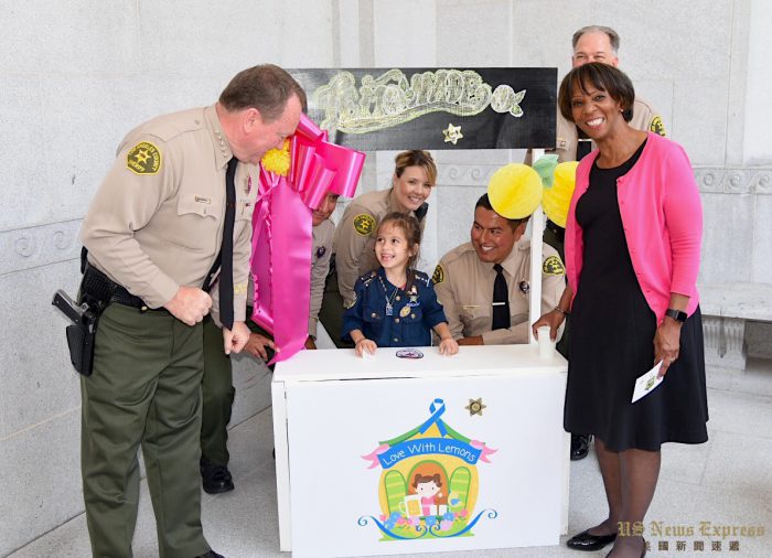 洛杉矶郡警察局和检察官办公室大力支持特蕾莎的爱心之举,警员们还特地为特蕾莎制作了一个全新的带有粉红色蝴蝶结的专业柠檬水摊位。特蕾莎当天看到时开心地表示,“太好了,这比我以前的那个好多了。”洛郡检察长蕾西(Jackie Lacey)还向特蕾莎赠送了速溶柠檬水,希望她的生意越来越好。