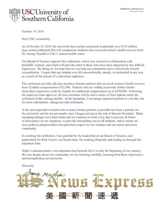 南加大临时校长奥斯汀(Wanda Austin)19日发布声明指出,理事会支持这一已经与原告律师达成的解决方案,并将为那些因此困难经历遭受影响的人提供帮助。通过此举,希望帮助社区集体向前。“我对任何因学校员工的行为而感到不舒服、不安全或被虐待的学生感到悲伤。”